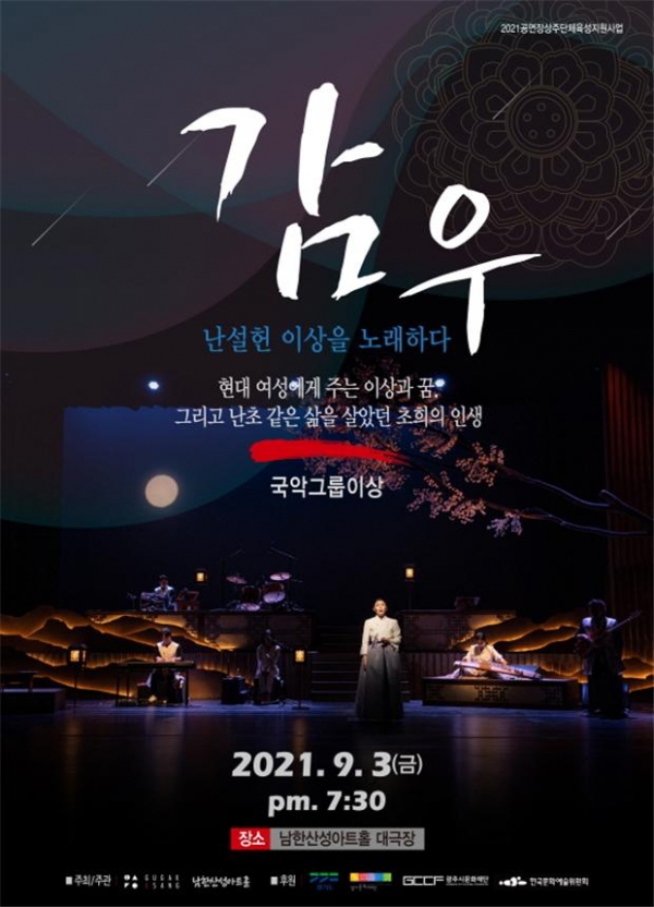 (재)광주시문화재단(대표이사 오세영)은 오는 9월 3일 남한산성아트홀에서 국악그룹 ‘이상’의 <난설헌, 이상을 노래하다 ‘감우’> 공연을 개최한다고 밝혔다.