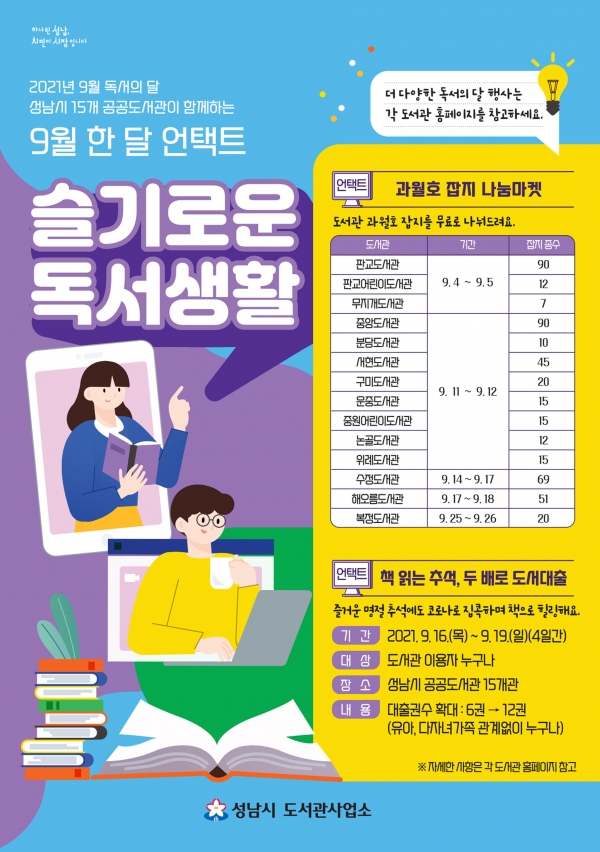 성남시(시장 은수미)는 코로나 시대 독서의 달을 맞아 9월 한 달간 15곳 공공도서관에서 슬기로운 독서 생활을 지원하는 다양한 언택트 행사를 마련한다.대표적으로 ‘과월호 잡지 나눔 마켓’과 ‘책 읽는 추석, 두 배로 도서 대출’ 행사가 열린다.