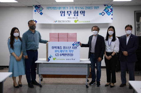 ㈜스킨사이언스는 성남시 판교에 위치한 의료ㆍ미용기기 제조 및 판매 업체로 지역사회와 동반 성장하기 위한 노력을 기울이고 있다.이번 협약식에서 양 기관은 지역 네트워크 구축과 취약계층 청소년 물품 지원 등 청소년의 건강한 성장 지원에 적극 나서기로 했다.