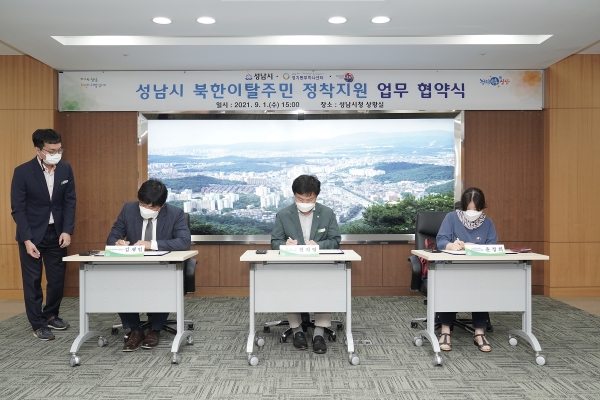 성남시(시장 은수미)는 9월 1일 성남시 거주 북한이탈주민의 안정적인 정착지원을 위해 지역 내 2개 유관기관과 북한이탈주민 정착지원 업무 협약식을 진행했다고 밝혔다.협약에는 경기동부하나센터(센터장 김재일)와 농업회사법인 국민주식회사(대표 윤정희)가 참여했다.