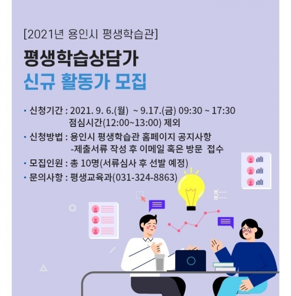 용인시가 오는 6일부터 17일까지 시민들의 평생학습을 상담 및 지원하는 신규 평생학습상담가를 모집한다.평생학습상담가는 시민들의 평생학습 참여를 돕는 전문 봉사자로, 용인시청과 처인·기흥·수지 등 3개 구청, 용인시 평생학습관 내에 설치된 평생학습지원센터에 상주하며 시민들에게 평생교육 정보 및 맞춤형 평생학습 상담을 제공하고 있다.