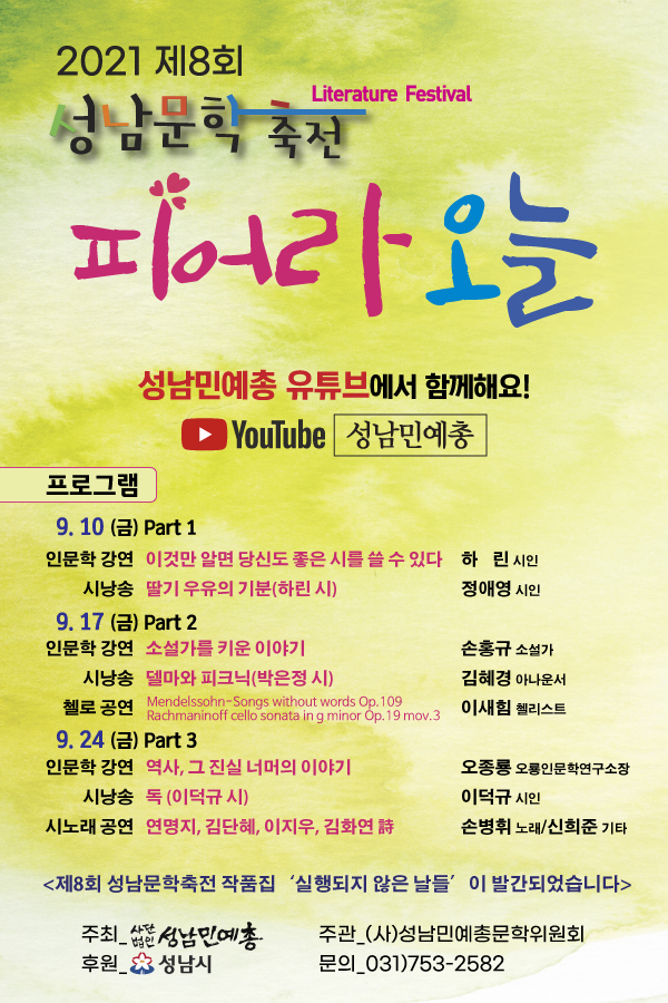 성남문학축전은 대한민국 대표 작가 등을 초청, 문학의 힘을 느낄 수 있는 인문학콘서트로 꾸며져 왔으며 성남 문학인들의 대표축제로 성장해오고 있다.이번 성남문학축전은 총 3부로 나누어 9월 10일부터 9월 24일까지, 3주에 걸쳐 매주 금요일에 유튜브 성남민예총 채널을 통해 공개된다.