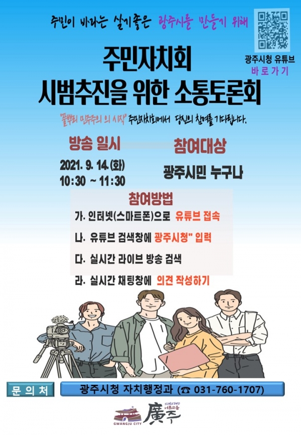 참여방법은 인터넷(스마트폰)으로 유튜브 접속 후 검색창에 ‘광주시청’을 입력하면 실시간 라이브 방송을 검색할 수 있으며 실시간 채팅창에 의견을 작성할 수도 있다. 방송 일정은 9월 14일 오전 10시30분부터 11시30분까지 진행되며 시민 누구나 참여 가능하다.