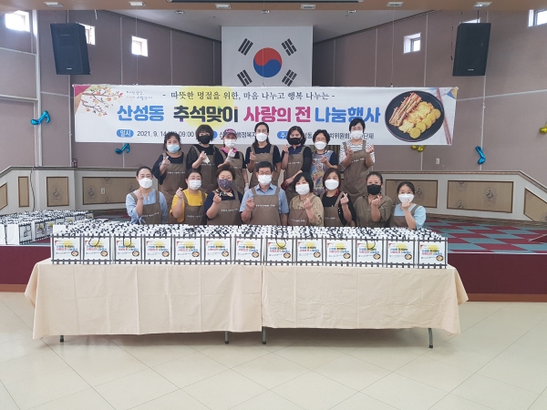 산성동주민자치위원회(위원장 성해련)가 관내 유관단체가 함께 14일 오전 9시 산성동 행정복지센터에서 추석맞이 사랑의 전 나눔의 행사를 진행했다.