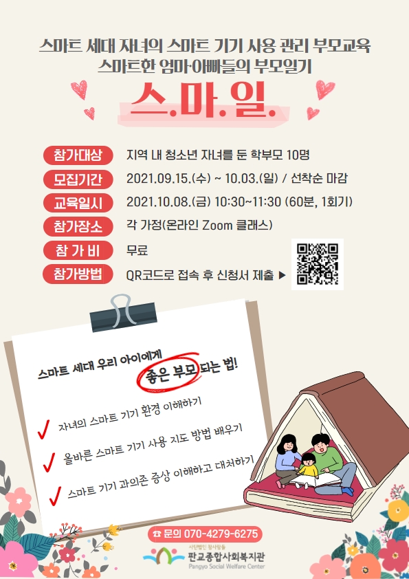 판교종합사회복지관에서는 오는 10월 8일(금), 스마트 세대 자녀의 스마트 기기 사용 관리 부모교육 ‘스마트한 엄마·아빠들의 부모일기, 스.마.일’을 진행한다.