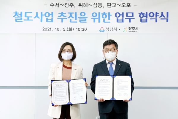 광주시는 5일 성남시청 회의실에서 신동헌 광주시장, 은수미 성남시장 등이 참석한 가운데 ‘광주·성남간 철도사업의 상호지원 및 협력체계 강화를 위한 업무협약’을 체결했다.