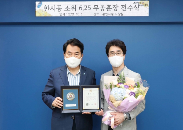 용인시가 6일 6·25전쟁 참전유공자인 한시동(91) 옹에게 화랑무공훈장을 전수했다.이날 백군기 시장은 용인시청 시장실에서 열린 전수식에서 국방부를 대신해 6·25전쟁 당시 101근무사단 소속 소위로 복무하며 나라를 위해 싸운 한시동 옹의 자녀 한경석(59) 씨에게 훈장과 꽃다발을 전달하고 감사 인사를 전했다.