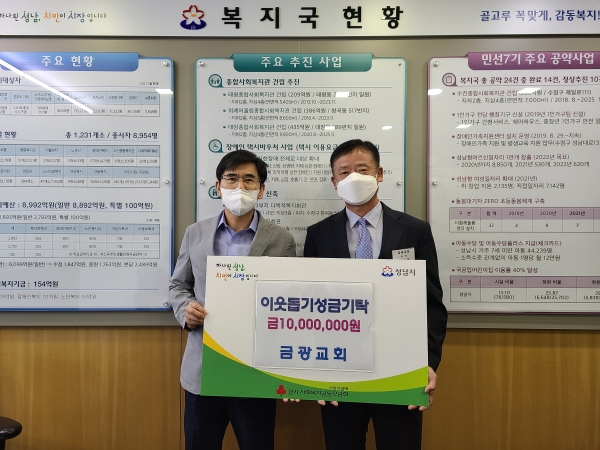 시는 이날 오후 2시 복지국장실에서 정인목 성남시 복지국장과 이수복 금광교회 장로 등이 참석한 가운데 ‘이웃돕기 기탁식’을 했다.기탁받은 금액은 코로나19의 장기화에 따른 성남시 어려운 이웃들을 위한 사업에 쓰기로 했다.
