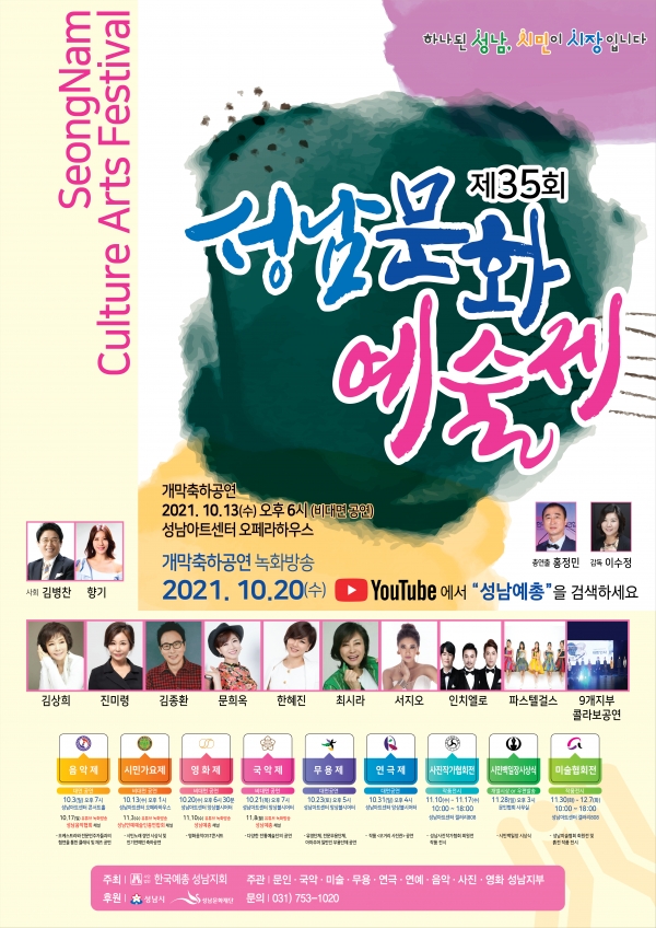 성남예총이 주최하고, 성남시와 성남문화재단의 후원으로 개최되는 성남시 대표축제 ‘제35회 성남문화예술제’가 코로나19 장기화로 지친 성남 시민들의 마음을 위로하기 위해 10월 3일 음악제를 시작으로 12월 7일 미술협회전까지 다채롭게 펼쳐질 예정이다.