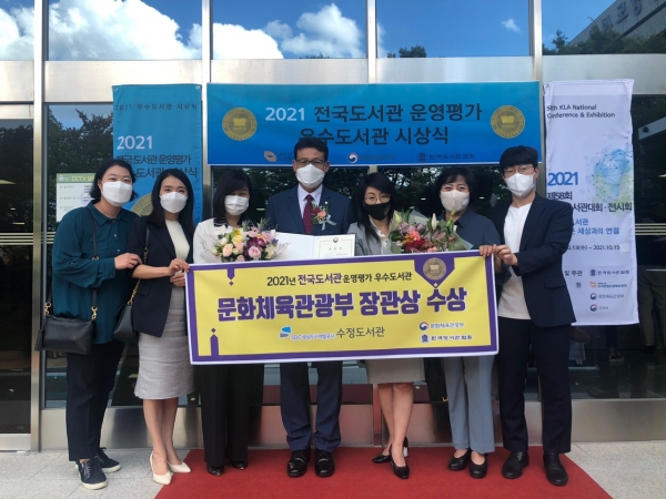성남시 수정도서관이 2021년도 전국도서관 운영평가에서 공공도서관 부문 우수도서관으로 선정되어 문화체육관광부 장관상을 수상하는 쾌거를 이뤘다.수정도서관은 성남시 원도심 지역인 수정구 거점도서관으로 20여 년간 지역주민의 독서문화생활 정착에 이바지 하는데 노력했으며, 올해 그 성과를 인정받아 우수도서관으로 선정됐다.