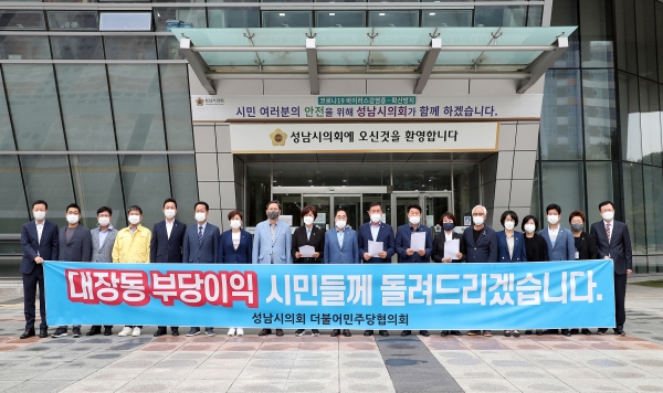 또한 실체적 진실규명과 함께 대장동 개발사업으로 인해 발생된 부당이익은 전액 환수하여 시민들께 돌려 주어야 한다. 이를 위해 더불어민주당 의원 일동은 청렴이행서약서에 위배되는 행위자를 신속하고 철저하게 가려 법적인 책임을 끝까지 물을 것을 성남시 집행부에 강력 요구한다.
