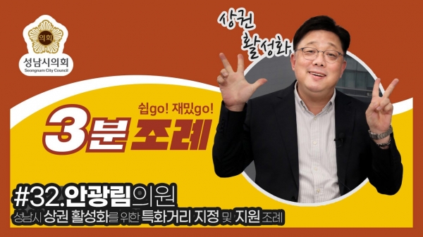 ‘성남시의회 3분 조례’는 유튜브, 페이스북 등 SNS 채널을 통하여 성남시의회 의원들이 발의하여 시행되는 조례를 시민들이 알기 쉽도록 설명하는 콘텐츠이다. 조례를 발의한 의원들이 직접 출연하는 토크쇼 형식 등으로 진행되며, 조례를 발의한 이유, 조례 발의 목적, 기대효과 등을 중점적으로 알릴 계획이다. 매주 월요일 오후 3시에 공개되며, 성남시의회 공식 유튜브 채널과 페이스북, 인스타그램에서 볼 수 있다.