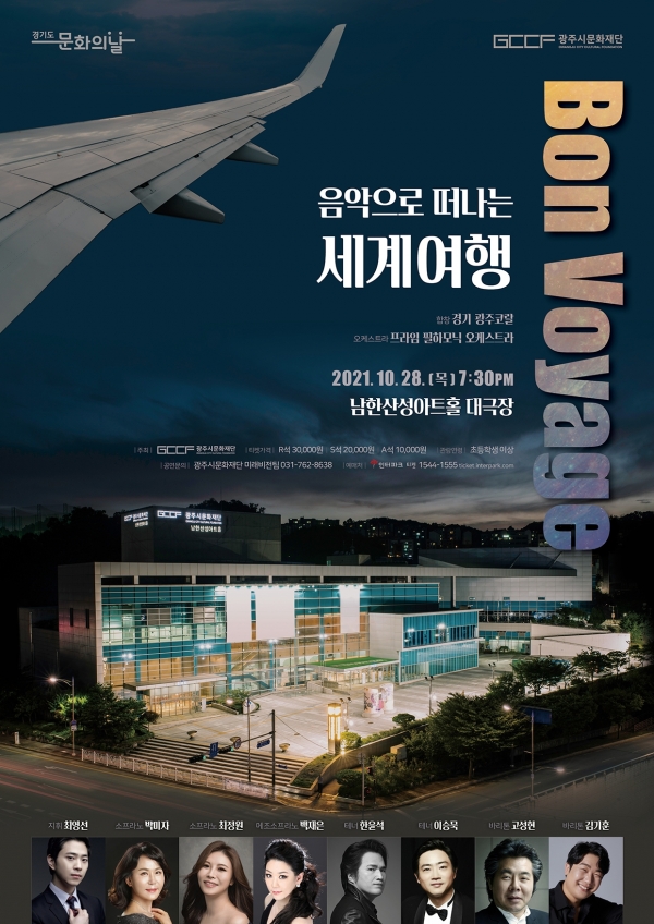 (재)광주시문화재단(대표이사 오세영)은 세계 각국의 가곡과 아리아를 만나는 <음악으로 떠나는 세계 여행 – 본 보야지(Bon Voyage)> 공연을 오는 10월 28일 남한산성아트홀에서 개최한다고 밝혔다.