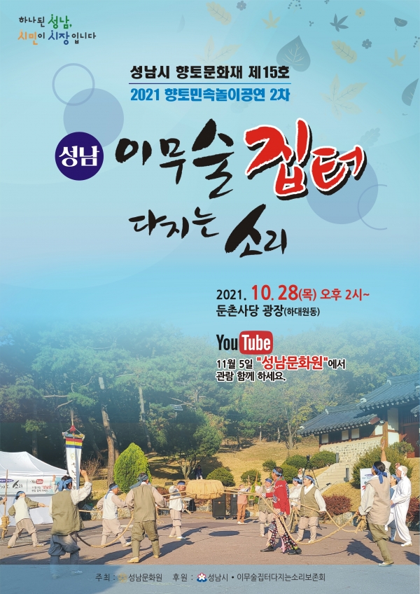성남문화원(원장/김대진)이 주최하고, 이무술집터다지는소리 보존회(회장 방영기)주관하는 성남향토민속놀이 두 번째 ‘이무술 집터 다지는 소리’ 공연이, 코로나19 방역수칙을 준수하며 10. 28(목) 촬영하여, 11월 5일 ‘성남문화원 유튜브’로 송출한다.