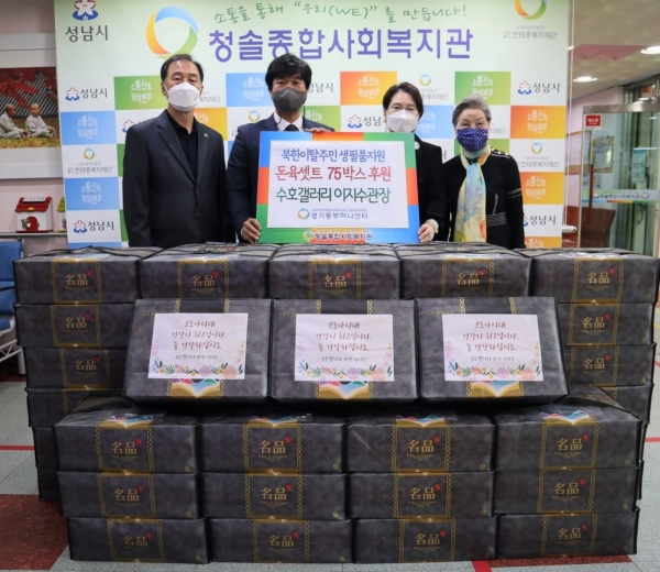 성남시 분당구 금곡동에 위치한 경기동부하나센터(센터장 김재일)와 수호갤러리(관장 이지수)는 지난 26일 경기동부하나센터에서 북한이탈주민의 안정적인 정착을 위해 약 300만 원 상당의 돈육세트 75개 후원 전달식을 진행하였다.