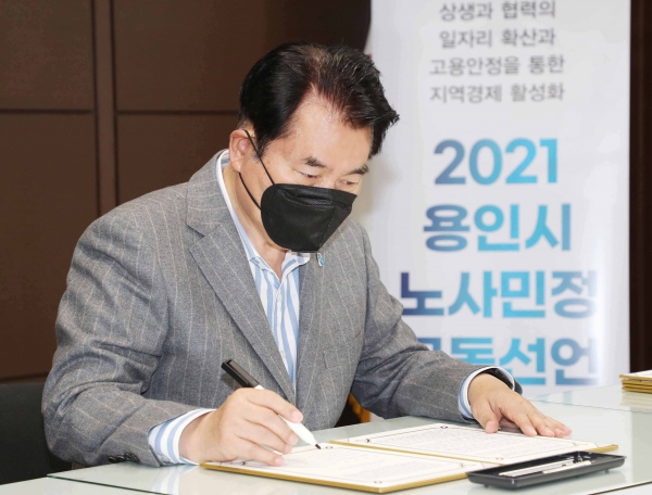 이 협약에는 용인시를 비롯해 용인시의회, 고용노동부 경기지청, 한국노총 용인지역지부, 용인상공회의소 등 5개 기관이 참여했다.공동선언문에는 노사 상생문화 정착과 동반성장, 양질의 일자리 창출과 고용안정, 필수노동자와 취약계층 보호·지원, 지역 중소기업과 소상공인을 위한 소비 촉진 등 지역경제 활성화를 위해 함께 협력한다는 내용이 담겼다.