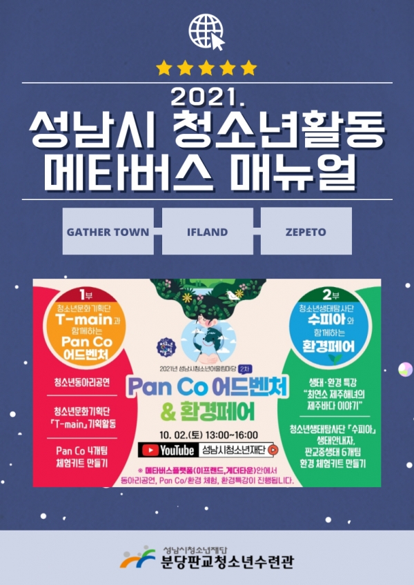 성남시청소년재단(대표이사 진미석) 분당판교청소년수련관은 코로나19로 인한 대면 청소년활동이 어려운 상황에 참고할 ‘2021 성남시 청소년활동 메타버스 매뉴얼’을 전국 최초로 제작했다.