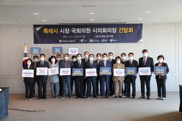 전국특례시시장협의회는 3일 서울 여의도 서울시티클럽 파크뷰에서 특례 사무 이양을 위한 시장·국회의원·시의장 간담회를 개최했다.이날 간담회는 지방분권법 개정 확보 방안을 논의하고, 대도시 특례사무를 담은 제2차 지방일괄이양법 국회 정상 심의 촉구 성명서를 발표하기 위하여 열렸다.