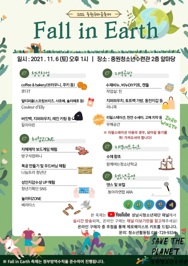성남시청소년재단(대표이사 진미석) 중원청소년수련관은 2021. 중원마을축제 “폴인어스(Fall in Earth)”축제를 중원청소년수련관 2층 앞마당에서 오는 6일 오후 1시부터 5시까지 개최한다.