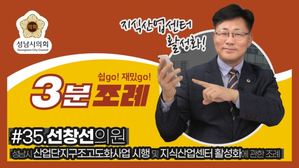 성남시의회(의장 윤창근)는 8일 ‘성남시의회 3분 조례’ 서른다섯 번째 영상을 SNS에 게시했다.이번에 소개된 조례는 선창선 의원 등 15명이 공동발의한 ‘성남시 산업단지구조고도화사업 시행 및 지식산업센터 활성화에 관한 조례’이다.