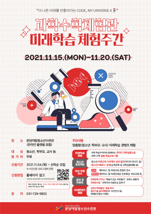 한편, 워드 코로나 시대에 발맞추어 코로나 확산방지를 위해 사전신청을 통해 참여 가능 하며 18세 청소년 이외, 보호자의 경우는 코로나 백신 접종 완료자에 한하여 신청할 수있다.자세한 내용 및 사전신청은 분당야탑청소년수련관 홈페이지나 온라인 신청플랫폼 (http://ytsteamus.kr)에서 확인할 수 있다.
