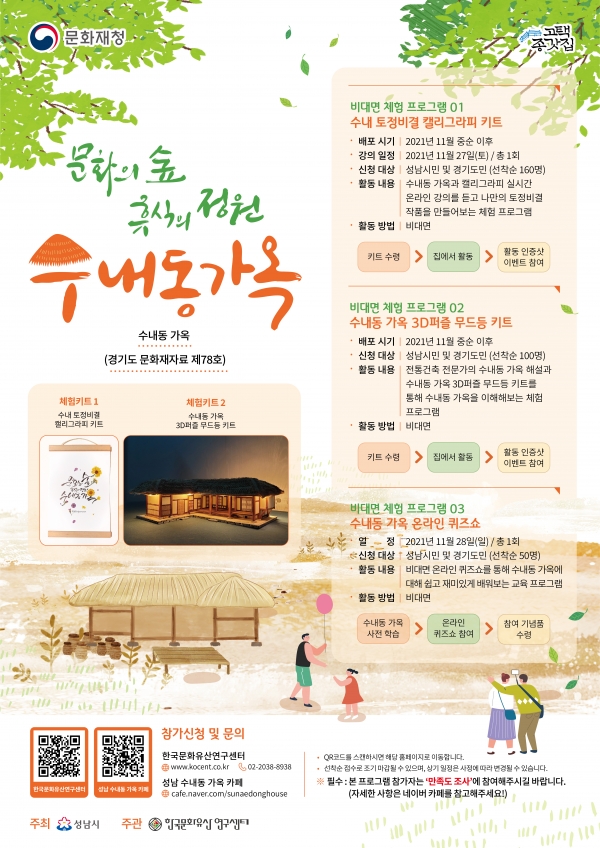한편, 성남시 관계자는 “코로나19 상황을 고려하여 집안에서도 수내동 가옥에 대해 배우고 즐길 수 있는 특별한 체험을 통해 지역문화유산인 수내동 가옥의 가치를 향유할 수 있을 것으로 기대한다고“ 밝혔다. '문화의 숲 - 휴식의 정원, 수내동 가옥' 네이버 카페(https://cafe.naver.com/sunaedonghouse)에서 살펴볼 수 있으며 주관 단체인 한국문화유산연구센터 문화유산활용팀(☎02-2038-8938)으로 문의