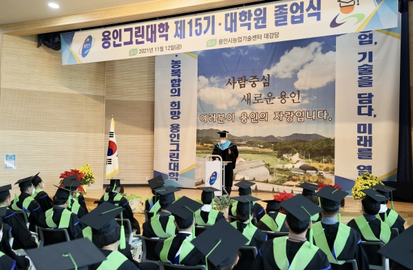 용인시는 12일 처인구 원삼면 용인시농업기술센터 대강당에서 용인그린대학 제15기 및 대학원 졸업식을 개최했다.용인그린대학은 농업 인재를 육성하고, 귀농 희망자의 정착을 돕기 위한 교육프로그램이다.