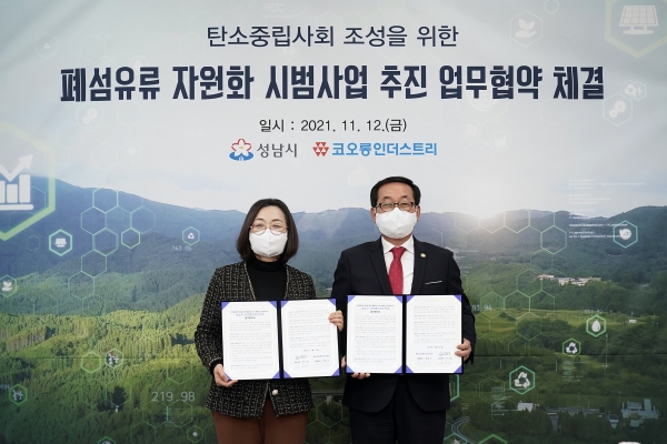 이를 위해 시는 11월 12일 시청 2층 회의실에서 은수미 성남시장과 장희구 코오롱인더스트리㈜ 대표이사 등이 참석한 가운데 ‘탄소중립사회 조성을 위한 폐섬유류 자원화 시범사업 추진 업무협약’을 했다.