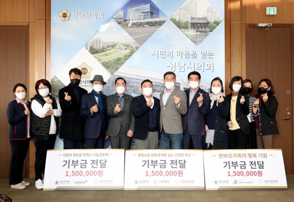 성남시의회(의장 윤창근)는 16일 의장실에서 관내 사회봉사단체 지원을 위하여 기부금 450만 원을 전달했다고 밝혔다.