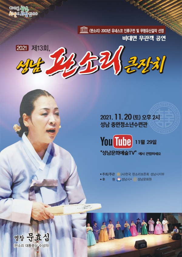 만추지절 아름다운 계절에 (사)한국판소리보존회 성남시지부(지부장 문효심)가 주최하는 ‘제13회 성남 판소리 큰잔치’가, 11. 20일 중원청소년수련관 공연장에서 코로나19로 인한 비대면 무관객 공연을 녹화한 뒤, 11월 29일 성남문화예술TV 유튜브로 송출한다.