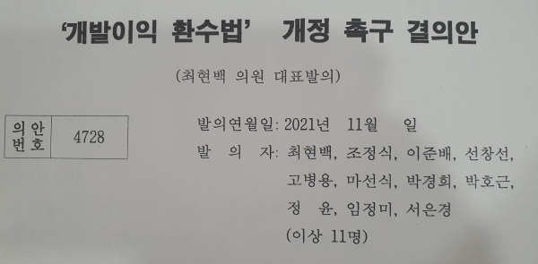 최현백의원은 “성남시의회 제268회 제2차 정례회에 판교대장지구와 같이 토건 비리 세력들에게 천문학적 부당이익이 흘러 들어가지 않도록 방지하고 치솟는 부동산 가격 등으로 고통받는 서민들의 피해를 최소화하여 국민의 주거 및 생활 안정을 도모하기 위해 국회와 국토부를 상대로‘개발이익 환수법 개정’촉구 결의안을 발의했다”고 밝혔다.