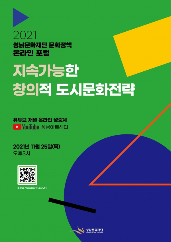 성남문화재단(대표이사 노재천)이 유네스코 창의도시 네트워크 회원도시를 향한 첫걸음으로 성남의 도시문화전략과 정책의제를 논의하는 <2021 성남문화재단 문화정책 온라인 포럼>을 오는 11월 25일(목) 오후 3시 재단 공식 유튜브 채널을 통해 생중계로 개최한다.