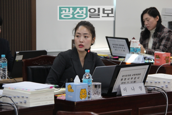 이나영 의원(더불어민주당, 성남7)은 행정사무감사를 시작하면서 행정사무감사 준비에 노고가 많았다는 인사와 함께 화성오산교육지원청의 화성 환희유치원 사태를 지적하며, 환희유치원 비상대책위원회 관계자 면담이나 후속 대응 방안, 더샵 파크시티 유치원 신설 문제 등을 질의했으나, 적절한 답변을 못하자 기본적인 실태조사가 안된 것 같다며 강한 질책을 했다.