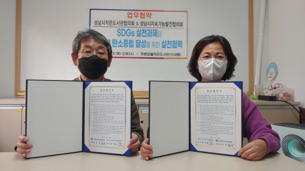 성남시지속가능발전협의회(이하 성남지속협, 상임회장 양호)와 성남시작은도서관협의회(이하 성도협, 회장 송은화)가 18일 ‘탈탄소 생활 실천 및 SDGs 이행 협력’을 위한 업무협약을 체결했다.