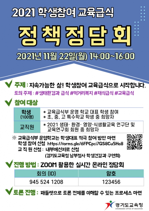 경기도교육청(교육감 이재정)은 22일 ‘지속가능하고 건강한 삶! 학생참여 교육급식’을 주제로 교육급식 정책정담회를 개최한다.