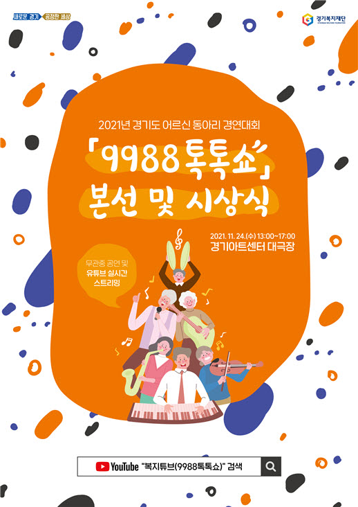 경기도가 24일 오후 1시 수원 경기아트센터에서 도내 어르신들의 재능공연 축제인 ‘2021 어르신 동아리 경연대회 9988 톡톡쇼’ 본선대회를 개최한다.