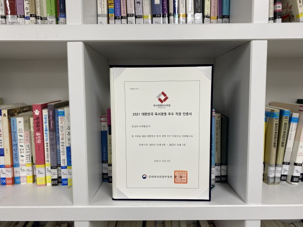 ‘2021 대한민국 독서경영 우수 직장 인증제’에서 신규 인증을 획득하며, 4년 연속 독서경영 우수 직장으로 선정됐다.