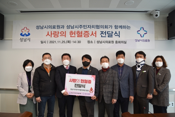 성남시의료원(원장 이중의)은 금일 성남시 주민자치협의회주관 「사랑의 헌혈 캠페인」에서 시민들이 기증한 헌혈증 69매를 전달받았다.