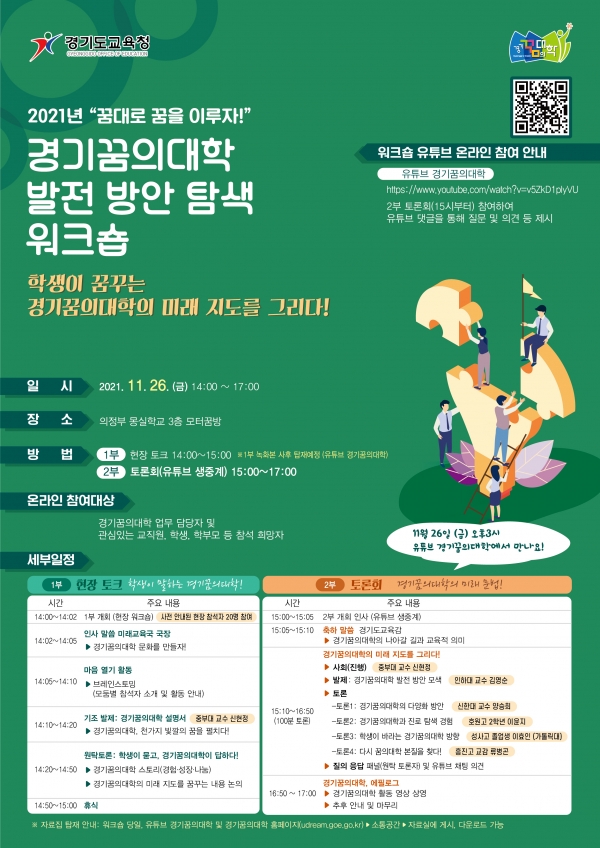 이에 2부 온라인 토론은 인하대 김영순 교수가 발표하는 경기꿈의대학 발전 방안을 주제로 학생, 교사, 교수 등 참석자들이 학생 진로 탐색을 위한 체험 기회 확대, 다양화를 위한 지역 활용 방안 등을 논의한다.