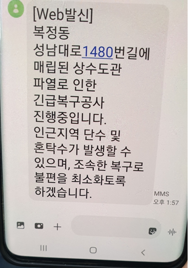 성남시 물공급과 관계자는 “수돗물은 우리 일상생활과 가장 밀접한 필수 자원”이라면서 “단수 상황 발생 때 신속히 공지해 시민 불편을 최소화하려고 전달력이 빠른 문자 알림 서비스를 도입했다”고 말했다.