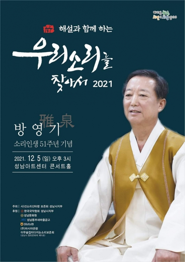 (사)선소리산타령보존회 성남시지부(지부장 방글) 주최, 성남시, 성남문화원, 성남국악협회가 후원하는 ‘2021 우리소리를 찾아서' 공연이, 12. 5(일)오후3시 성남아트센터 콘서트홀에서 열린다.