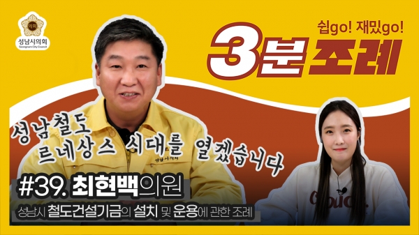 성남시의회(의장 윤창근)는 6일 ‘성남시의회 3분 조례’ 서른아홉 번째 영상을 SNS에 게시했다.이번에 소개된 조례는 최현백 의원 등 19명이 공동발의한 ‘성남시 철도건설기금의 설치 및 운용에 관한 조례’이다.