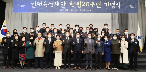 용인시 인재육성재단이 10일 용인시청 컨벤션홀에서 재단 창립 20주년 기념식을 개최하고 18명에 표창·공로패 등을 전달했다.