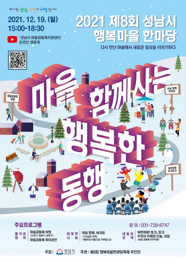 성남시는 ‘제8회 행복마을 한마당’ 행사를 오는 12월 19일 오후 3시~6시 30분 온라인으로 개최한다.코로나19로 2년 만에 개최하는 성남시 마을공동체 활동가들의 축제다.