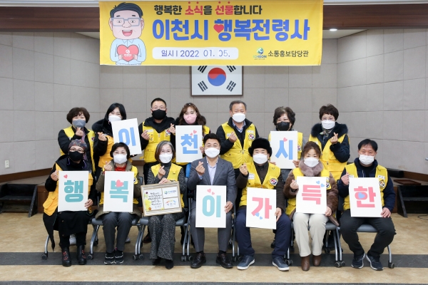 이천시 행복전령사는 관내 사회단체들의 공익적 활동을 소개하는 칭찬릴레이로 시민화합과 신뢰 넘치는 지역사회 조성을 위해 지속적으로 운영할 계획이다. 다음 행복전령사는 대한적십자사 이천지구협의회 박정환 회장의 추천으로 진행될 예정이다.