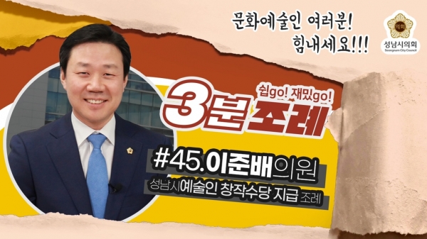 성남시의회(의장 윤창근)는 17일 ‘성남시의회 3분 조례’ 마흔다섯 번째 영상을 시의회 공식 SNS에 게시했다.이번에 소개된 조례는 이준배 의원 등 10명이 공동발의한 ‘성남시 예술인 창작수당 지급 조례’이다.