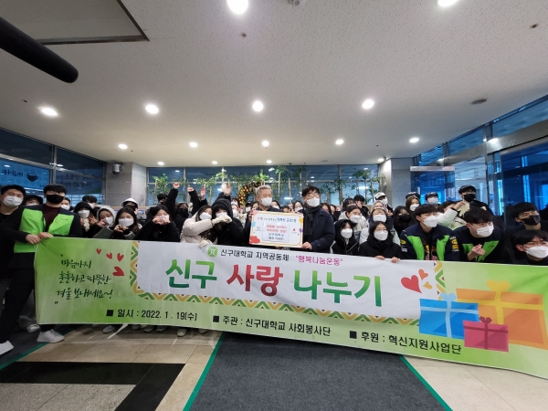 신구대학교에서는 금광2동 행정복지센터뿐만 아니라 학교 인근지역(은행1동 행정복지센터, 성남시다문화가족센터 등)에 매년 어려운 이웃을 위해 후원 물품을 전달하고 있으며, 학교와는 별개로 학과 및 부속유치원 등에서도 꾸준히 복지 소외계층을 위해 깊은 관심을 기울이며 각종 후원과 사랑 나누기 운동에 동참하고 있다.성남시에서는 연말연시 사랑 나누기 행사를 오는 2월 4일(금)까지 추진하고 있으며, 후원을 원하는 경우 지역의 행정복지센터 복지 창구에서 성금 및 성품으로 후원할 수 있다.