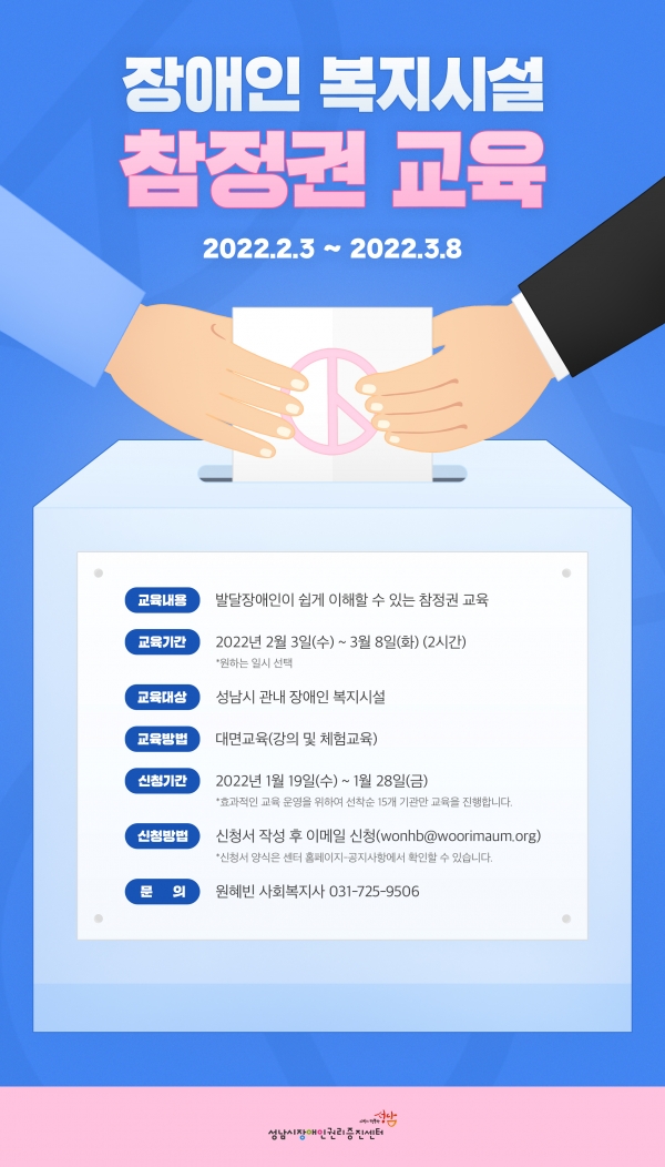 제20대 대통령 선거 전날인 3월 8일까지 성남시 장애인 복지시설 이용자를 대상으로 참정권 교육을 진행한다고 밝혔다.
