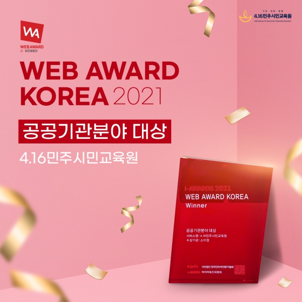 4.16민주시민교육원(원장 전명선)이 한국인터넷전문가협회(KIPEA)가 주최하는 ‘2021 웹어워드 코리아’ 공공기관분야 대상을 수상했다고 20일 밝혔다.