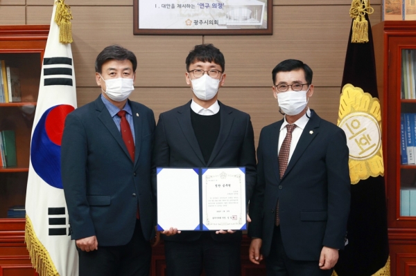광주시의회(의장 임일혁)는 지난 19일, 1월의 칭찬릴레이 칭찬 공무원으로 건축과 김광섭 건축2팀장(지방시설주사)을 선정, 의장실에서 증서를 수여했다.
